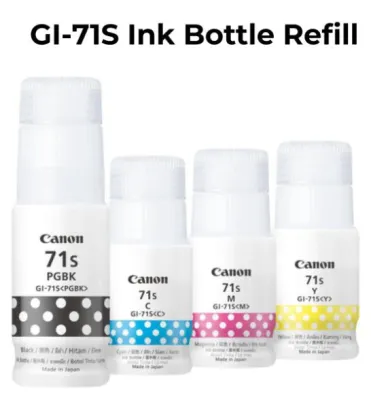 Canon GI-71/71S Ink Bottle (Black, Cyan, Magenta, Yellow) Offer high volume printing at extremely low running cost High Page Yield Ink Bottles With high page yield ink bottles - users can enjoy printing without having to worry about cost of ink, or ink supplies running low.