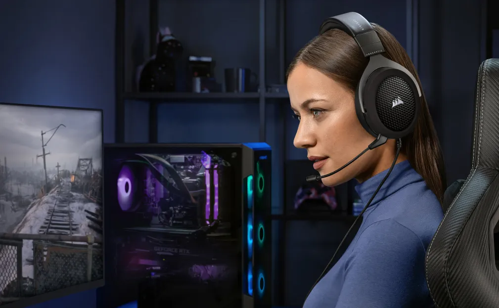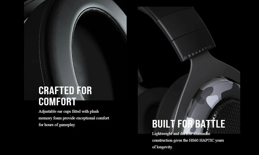 The CORSAIR HS60 HAPTIC Gaming Headset delivers haptic bass that you can feel, with comfortable memory foam ear pads and custom-tuned 50mm neodymium audio drivers for quality audio.