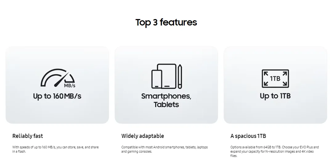 UP TO 1TB to store more fun. Enhanced speed and compatibility deliver reliable performance. Huge capacity lets you store tons of media on your phone, load your handheld console with games, or download more apps on your tablet. Top-notch speed makes transfers seamless with trusted reliability, all in a slick new design.