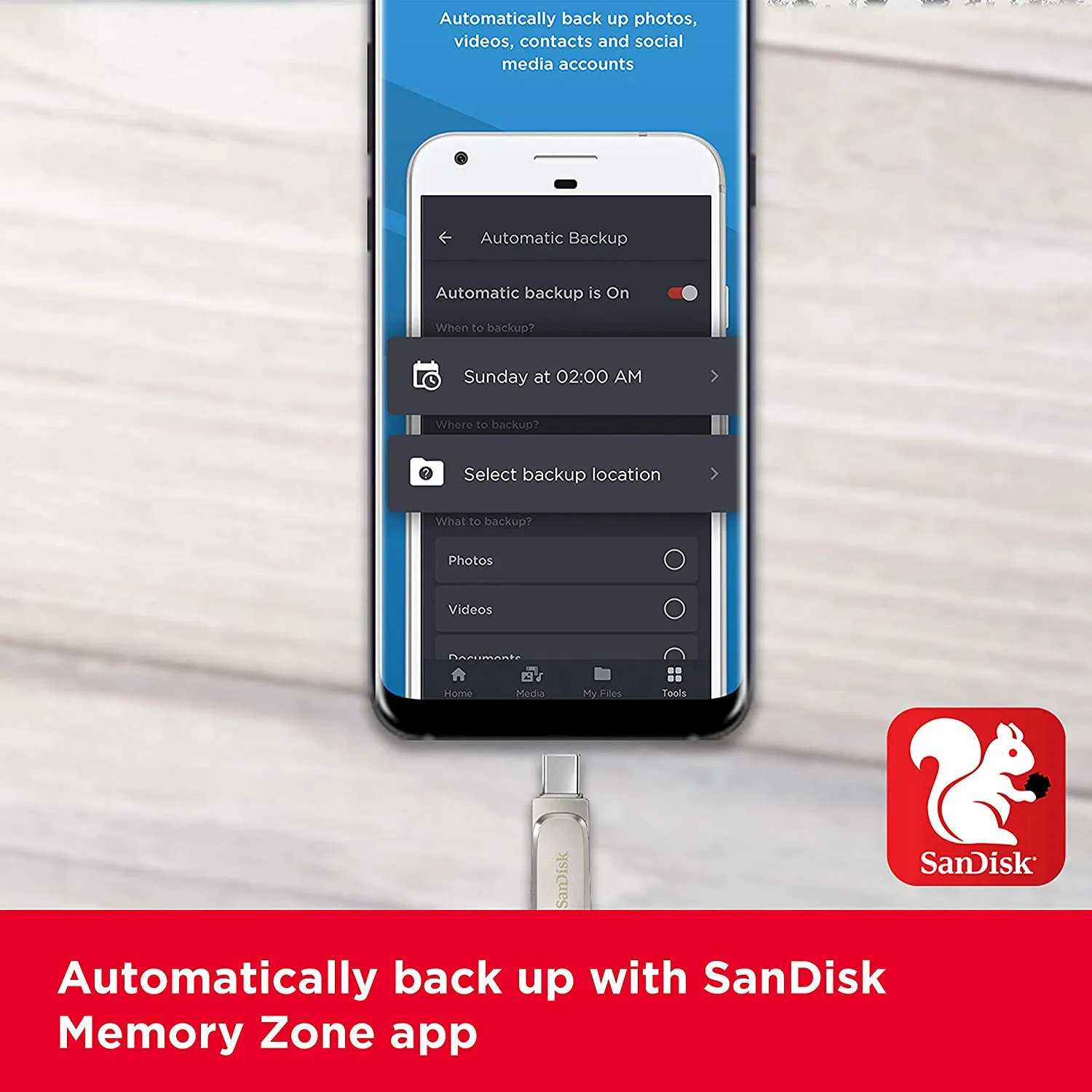 The all-metal, 2-in-1 flash drive with a reversible USB Type-C and a traditional Type-A connector.Seamlessly move content between your USB Type-C smartphone, tablets and Macs and USB Type-A computers.(2)Free up space on your USB Type-C smartphone so you can take more photos.(2)Automatically back up photos using the SanDisk Memory Zone app.(3)