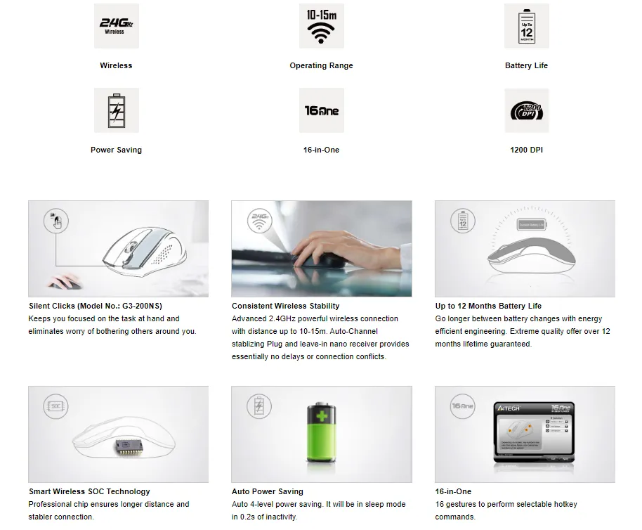 specifications Connection: 2.4GHz wireless Sensor Type: Optical Resolution: 1000 or 1200 DPI (may vary by model) Report Rate: 125Hz Buttons: ... Read more