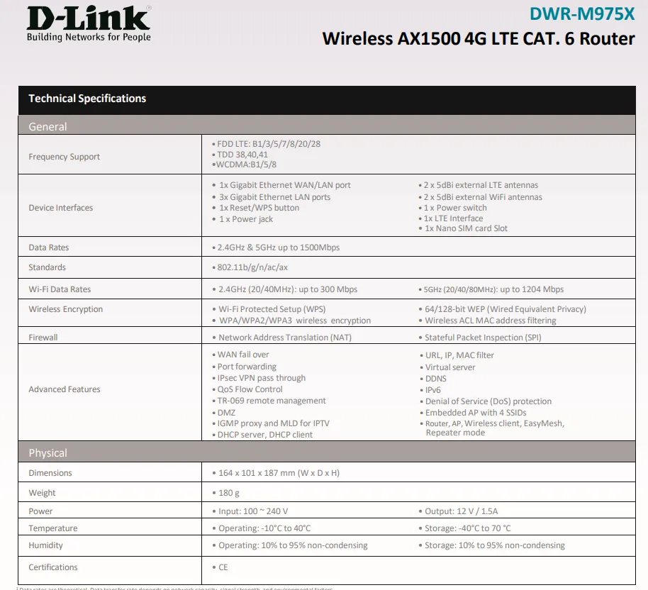 D-Link DWR-M975X 4G LTE Cat 6 Wi-Fi 6 Gigabit Mobile Router