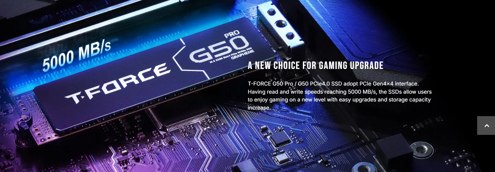 T-FORCE G50 Pro / G50 PCIe4.0 SSD adopt PCIe Gen4x4 interface. Having read and write speeds reaching 5000 MB/s, the SSDs allow users to enjoy gaming on a new level with easy upgrades and storage capacity increase.