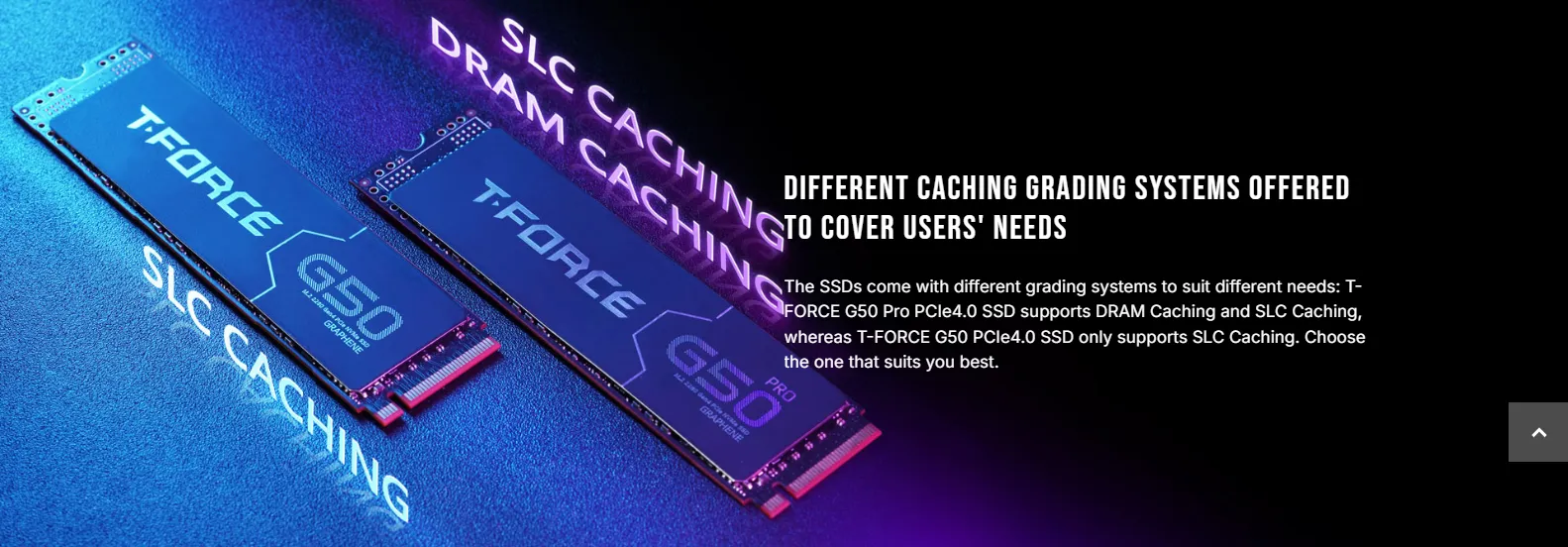 The SSDs come with different grading systems to suit different needs: T-FORCE G50 Pro PCIe4.0 SSD supports DRAM Caching and SLC Caching, whereas T-FORCE G50 PCIe4.0 SSD only supports SLC Caching. Choose the one that suits you best.
