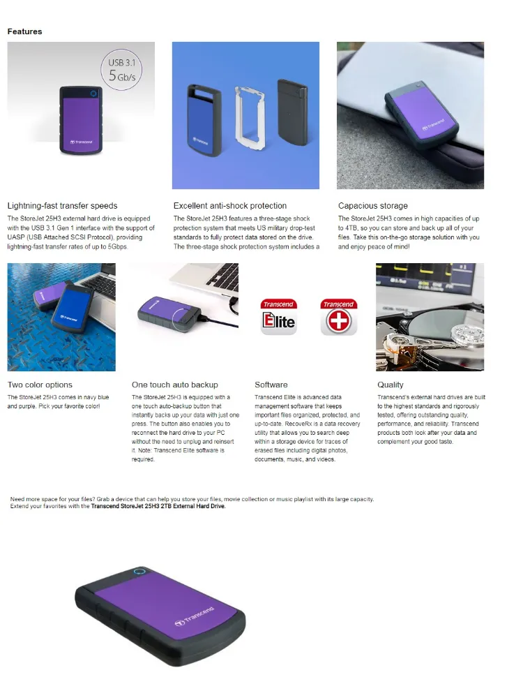 | Software Note | — | Transcend Elite software required for One-Touch Auto-Backup and AES encryption |