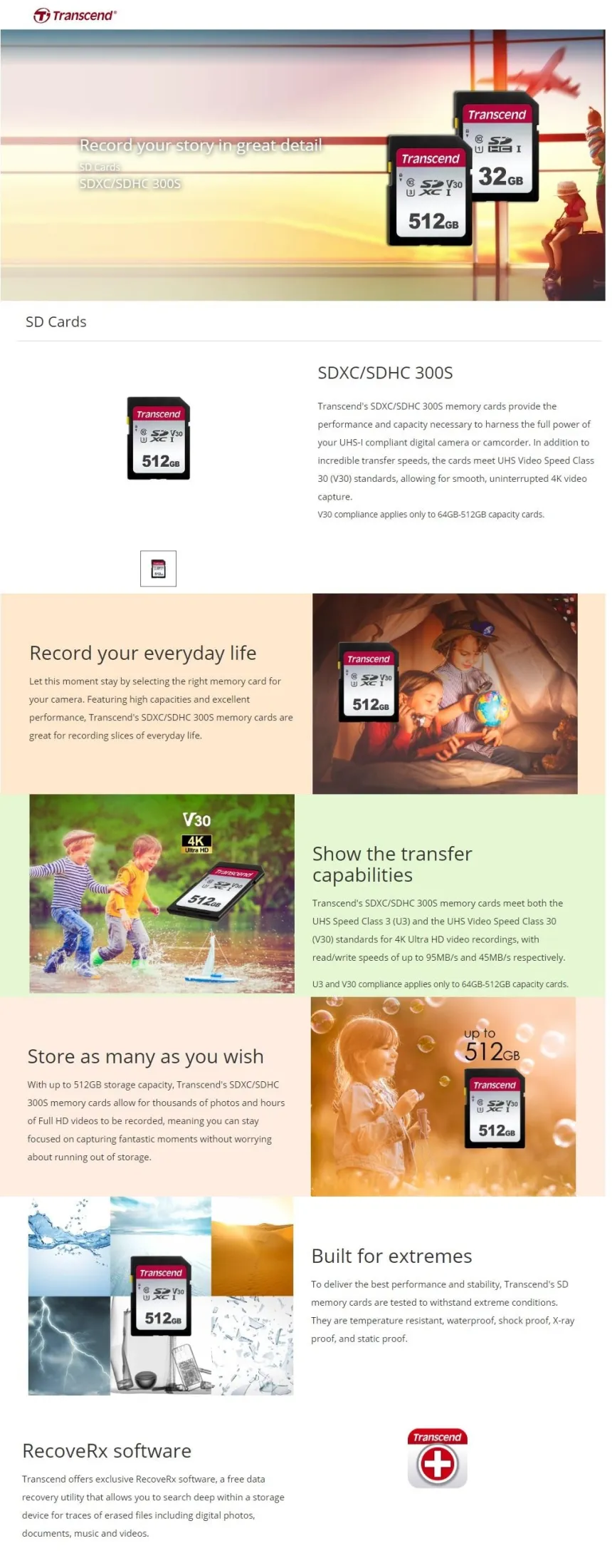 Transcends SDXC/SDHC 300S memory cards meet both the UHS Speed Class 3 (U3) and the UHS Video Speed Class 30 (V30) standards for 4K Ultra HD video recordings, with read/write speeds of up to 100MB/s and 85MB/s respectively.