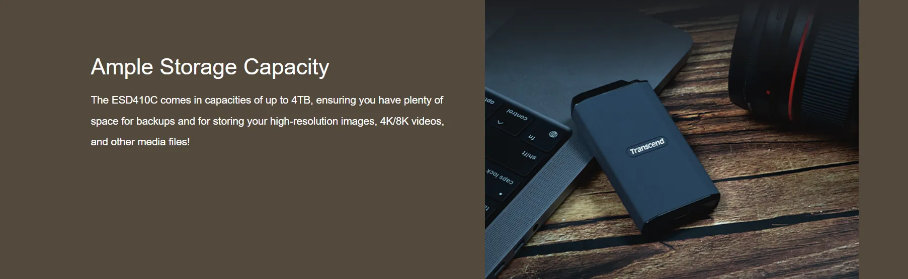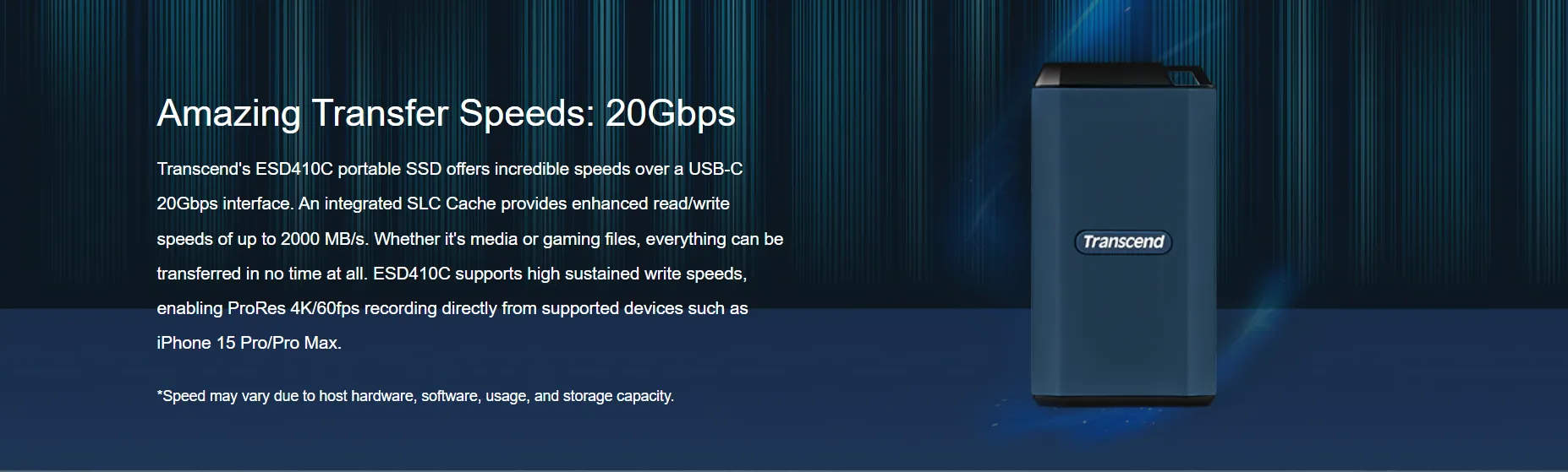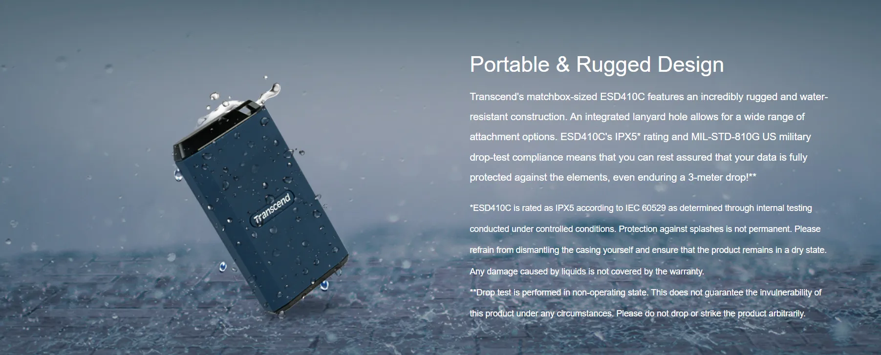 Transcend's ESD410C portable SSD features blistering speeds and impressive durability. With a transfer rate up to 20Gbps, dealing with large files is virtually worry-free. Compliant with the US military-grade drop test, the compact ESD410C can endure a 3-meter drop and meets IPX5 standard, securing data inside with a high-level of protection, suitable for outdoor photographers, travelers, and content creators.