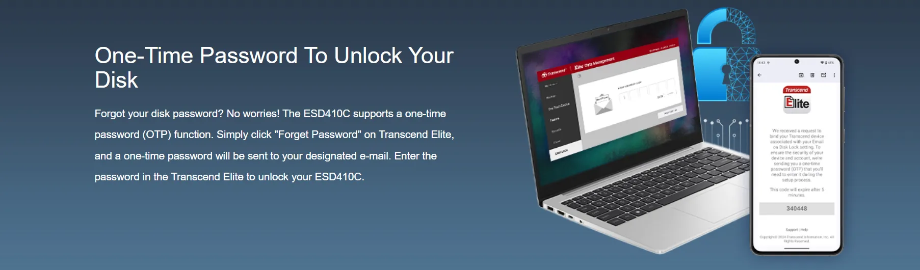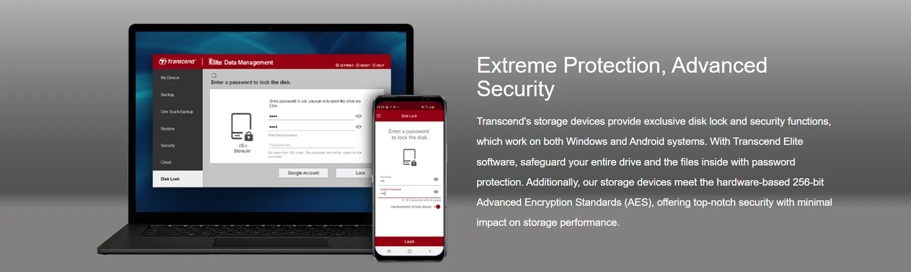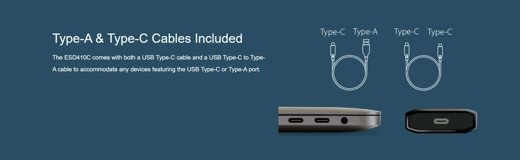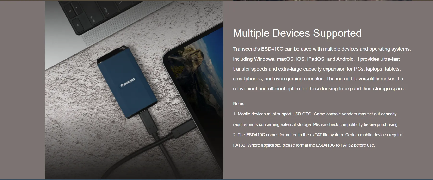 Transcend's ESD410C portable SSD features blistering speeds and impressive durability. With a transfer rate up to 20Gbps, dealing with large files is virtually worry-free. Compliant with the US military-grade drop test, the compact ESD410C can endure a 3-meter drop and meets IPX5 standard, securing data inside with a high-level of protection, suitable for outdoor photographers, travelers, and content creators.